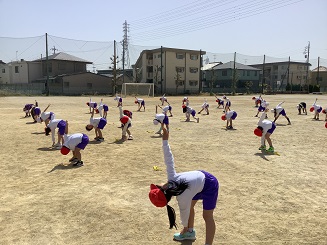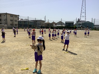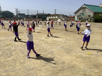 七宝小学校では、音楽を合わせて準備運動を行っています。