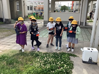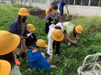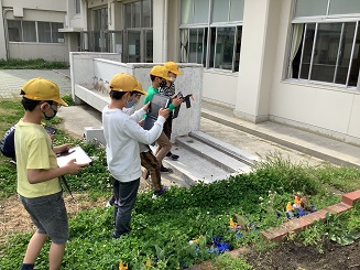 6時間目、4年生が中庭や運動場でタブレットを使って授業をしていました。
