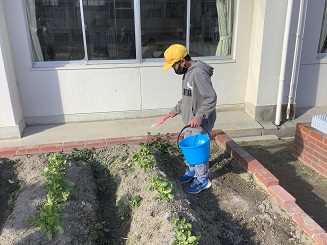 緑の羽根募金で購入した肥料をまきました。