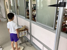 発育測定は、密を回避するために各学年に道具を持っていき廊下で実施しています