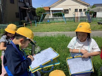 プリントに書かれたチェックポイントで、周りにあるものを書き込みます。