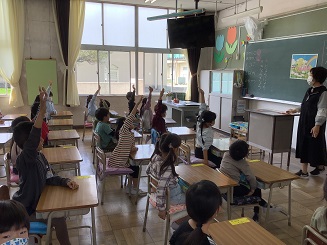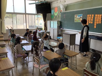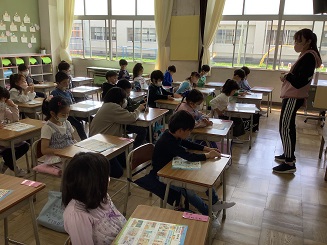 「1年1組1年生~」と先生に続いて元気いっぱい音読する声が