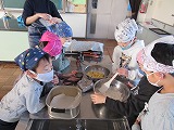 サツマイモ・砂糖・牛乳・ホットケーキミックス等をボールの中で混ぜ合わせ、適量をグラシンカップに入れていきます。その後、カップを蒸し器に入れ15分ほど経つと、おいしい鬼まんじゅうが出来上がりました。自分たちで育てたサツマイモでつくった鬼まんじゅうの味は格別だったようです。