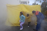 5・6年生は救助袋体験です。3階に設置された救助口から1階へ、滑り台をすべるように避難します。