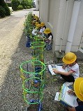 生活科「大きくそだて、わたしの野さい」では、トマトの苗を一人一鉢と、畑で夏野菜を6種類育てています。
