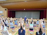 初日の今日は、あいにくの雨。体育館で、水泳について講義をしていただきました。