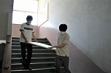全作品が玄関に集まったころ、卒業生が2人、偶然顔を見せてくれました。並べられた作品の数々を見て、