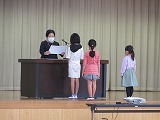 次に夏休みの宿題の表彰を行いました。時間をかけてじっくりと研究に取り組んだ「理科作品」、素敵な本に出合い、気持ちをつづった「読書感想文」。みなさんも秋の夜長に素敵な一冊に出合えるとよいですね。