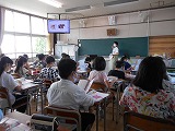 5年生の外国語の授業です。高学年の外国語は週2時間。担任とALTのTT授業で進めます。ALTの先生は指示のほとんどを英語で行います。子どもたちは、それを聞き取って教科書の指定されたページを開いたり、問いに答えたりしています。時には聞き取ることができないこともありますが、大丈夫。英語の指示の後には日本語で指示が出されます。そうやって少しずつ英語に耳が慣れ、正しく聞き取ることができるようになっていきます。